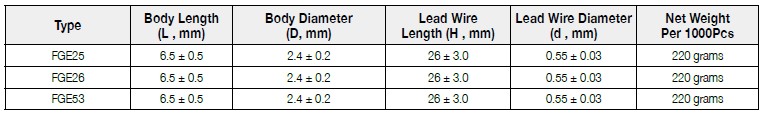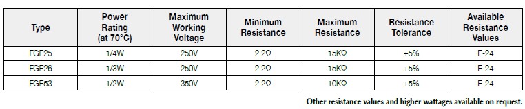 Fusible Resistor (FGE series) with axial leaded type, features a power rating from 0.25W to 3W, resistance range from 2.2 ohms to 15K ohms, and flameproof feature equivalent to overload test UL 1412. The fusible resistor is a special resistor made to protect every circuit.
