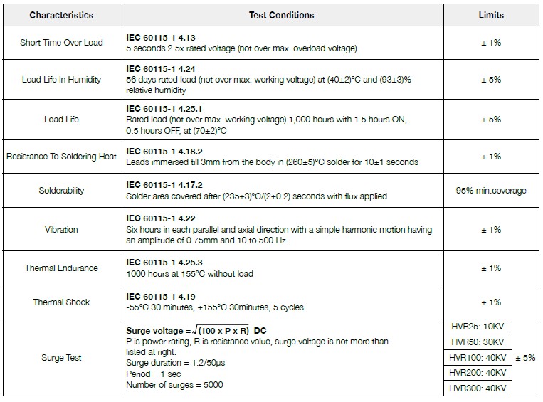 Performance Specifications for High Voltage Resistor, HVR series